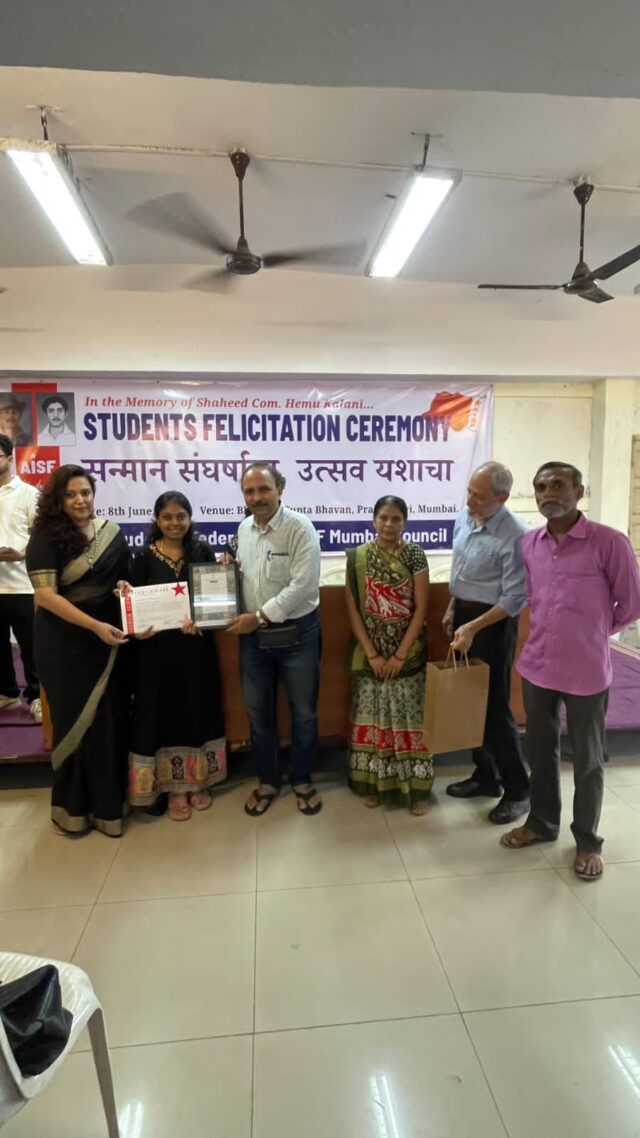 ऑल इंडिया स्टुडंट्स फेडरेशन (AISF) – मुंबई तर्फे “शहीद कॉ. हेमू कलानी विद्यार्थी सन्मान समारंभ” उत्साहात आणि स्फूर्तीदायक वातावरणात पार पडला. मुंबईतील सफाई व मेंटेनन्स कामगारांच्या १०वी व १२वी उत्तीर्ण मुलांचा या कार्यक्रमात सन्मान करण्यात आला.