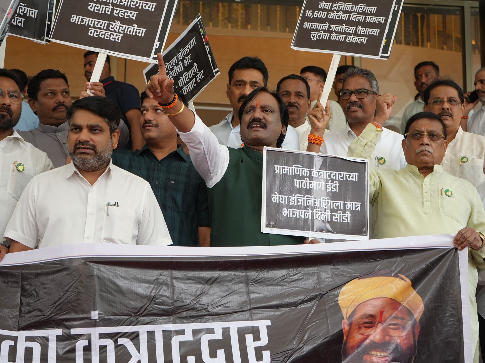 महायुती -भाजप सरकारची लाडकी कंपनी मेघा इंजिनिअरिंगला राज्यात अनेक प्रकल्प निकृष्ट दर्जाचे काम करून सुद्धा देण्यात आले आहे. मेघा इंजिनिअरिंगने महाराष्ट्रात विविध विकास कामांत ३ हजार कोटीचा भ्रष्टाचार केला असल्याने आज विधानभवनाच्या पायऱ्यांवर महाविकास आघाडीच्या आमदारांनी या विरोधात जोरदार घोषणाबाजी करत आंदोलन केले.