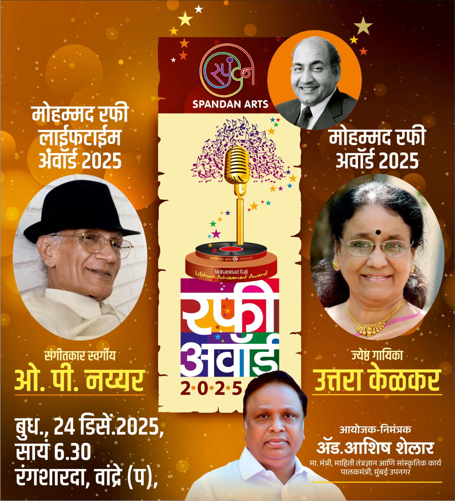 हिंदीमधील अजरामर गाण्‍यांना चाली देऊन संगीत जगतात आपले अढळ स्‍थान निर्माण करणा-या ज्येष्ठ संगीतकार ओ. पी. नय्यर यांना मरणोत्तर यावर्षीचा मोहम्मद रफी जीवन गौरव पुरस्‍कार तर सुप्रसिध्‍द गायिका उत्तरा केळकर यांना सन २०२५ चा मोहम्‍मद रफी पुरस्‍कार देण्‍यात येणार असल्‍याची घोषणा राज्याचे सांस्कृतिक मंत्री अॅड आशिष शेलार यांनी आज केली.