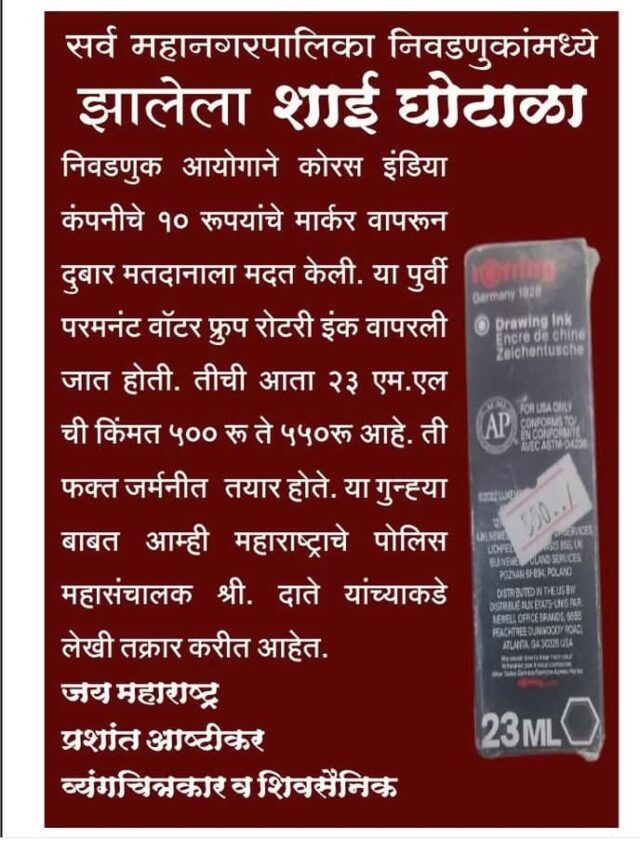 यात तक्रारीत या शाई व मार्कर पेनची खरेदी करणाऱ्या राज्य निवडणूक आयोग, राज्य सरकारवर आणि या लोकशाहीच्या उत्सवाची व जनतेची फसवणूक करणाऱ्या भयंकर रॅकेटवाल्यांवर कारवाई करण्याची आणि ही निवडणूक प्रक्रिया रद्द करण्याची मागणी केली आहे.