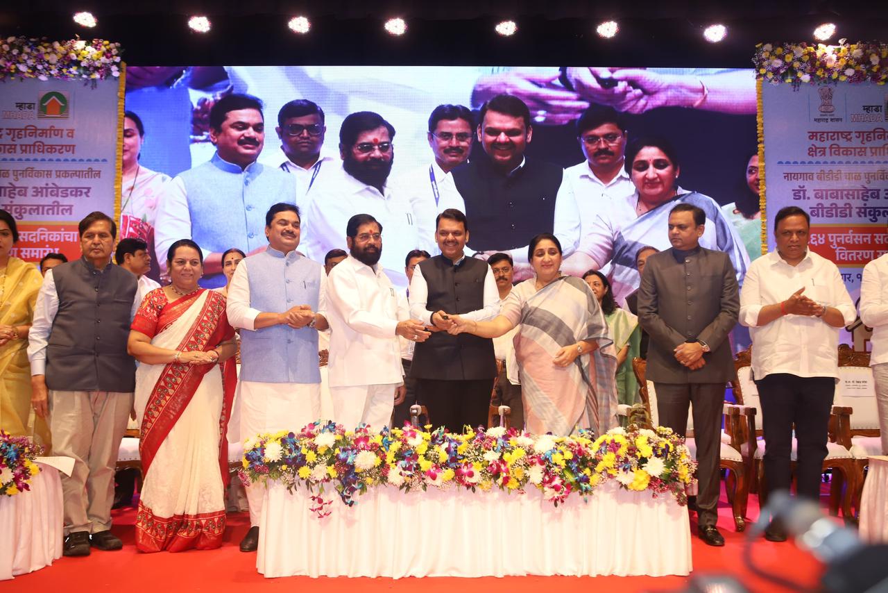 मुंबई :- मुंबईतील नायगाव बिडीडी चाळ पुनर्विकास प्रकल्पातील डॉ. बाबासाहेब आंबेडकर संकुलातील ८६४ सदनिकांचा वितरण समारंभ आज पार पडला. यावेळी मुख्यमंत्री देवेंद्र फडणवीस यांच्या शुभहस्ते या सदनिकाधारकांना चाव्यांचे प्रातिनिधिक स्वरूपात वाटप करण्यात आले. त्यामुळे हा दिवस त्यांच्या आयुष्यात पाडाव्या आधीच गोडवा आणणारा ठरला.