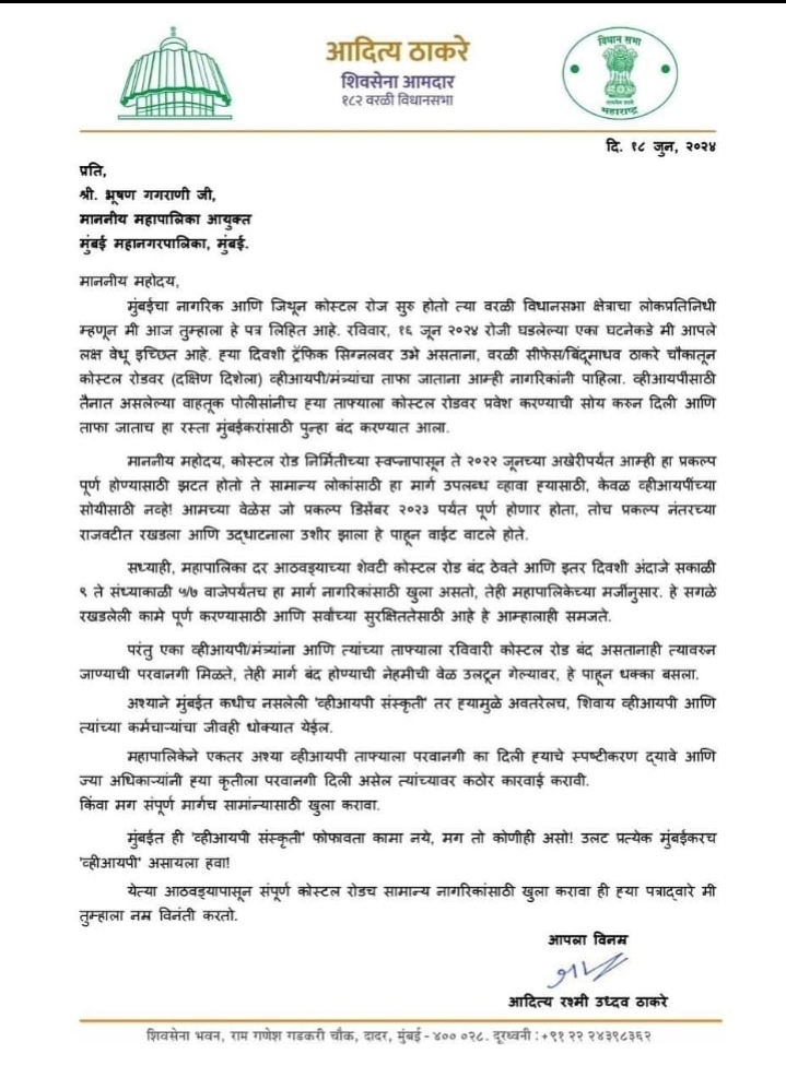 @mybmc ला पत्र लिहून वरळी ते मरीन ड्राइव्ह हा कोस्टल रोड सर्व नागरिकांसाठी समान रीतीने खुला करण्याची आ आदित्य ठाकरेंची मागणी