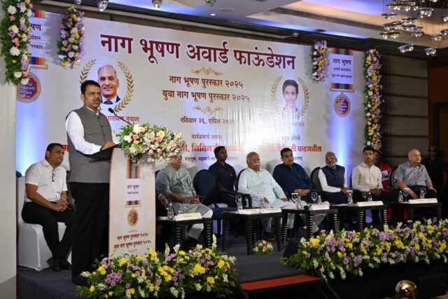 नाग भूषण अवॉर्ड फाउंडेशनच्या वतीने हॉटेल रेडिसन ब्लू येथील समिट सभागृहात आयोजित आयोजित नाग भूषण पुरस्कार-२०२५ समारंभात प्रमुख अतिथी म्हणून मुख्यमंत्री देवेंद्र फडणवीस हे बोलत होते. केंद्रीय रस्ते वाहतूक आणि महामार्ग मंत्री नितीन गडकरी हे या समारंभाच्या अध्यक्षस्थानी होते. राष्ट्रीय स्वयंसेवक संघाचे सरसंघचालक डॉ. मोहन भागवत तसेच अर्थ व नियोजन राज्यमंत्री अॅड. आशीष जयस्वाल यावेळी मंचावर उपस्थित होते. या समारंभात सोलर इंडस्ट्री इंडियाचे अध्यक्ष पद्मश्री सत्यनारायण नुवाल यांना प्रतिष्ठित अशा नाग भूषण पुरस्कार २०२५ ने, तर ‘आयरन मॅन ऑस्ट्रेलिया’ स्पर्धेचे विजेते दक्ष खंते यांना युवा नाग भूषण पुरस्कार २०२५ ने सन्मानित करण्यात आले. सरसंघचालक डॉ. मोहन भागवत यांच्या हस्ते त्यांना हे सन्मान प्रदान करण्यात आले.
