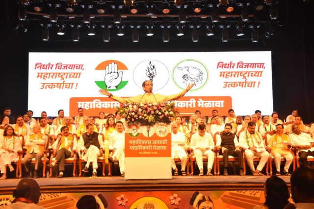विधानसभा २०२४ निवडणुकांच्या अनुषंगाने महाविकास आघाडीच्या पदाधिकाऱ्यांच्या मेळाव्याचे आयोजन आज मुंबईच्या माटुंगा येथील षण्मुखानंद सभागृहात संपन्न झाला. या मेळाव्याला महाविकस आघाडीतील घटक पक्षातील पदाधिकाऱ्यांनी मोठ्या संख्येने उपस्थिती लावली होती . शिवसेना नेते, युवासेना प्रमुख, मां. आमदार आदित्यजी ठाकरे यांनी पदाधिकाऱ्यांना मेळाव्यातून मार्गदर्शन केलं . यावेळी ‘महाराष्ट्राची एकजूट महायुतीला पराभूत करू शकते’, असा विश्वास आदित्य ठाकरे यांनी पदाधिकाऱ्यांना दिला .