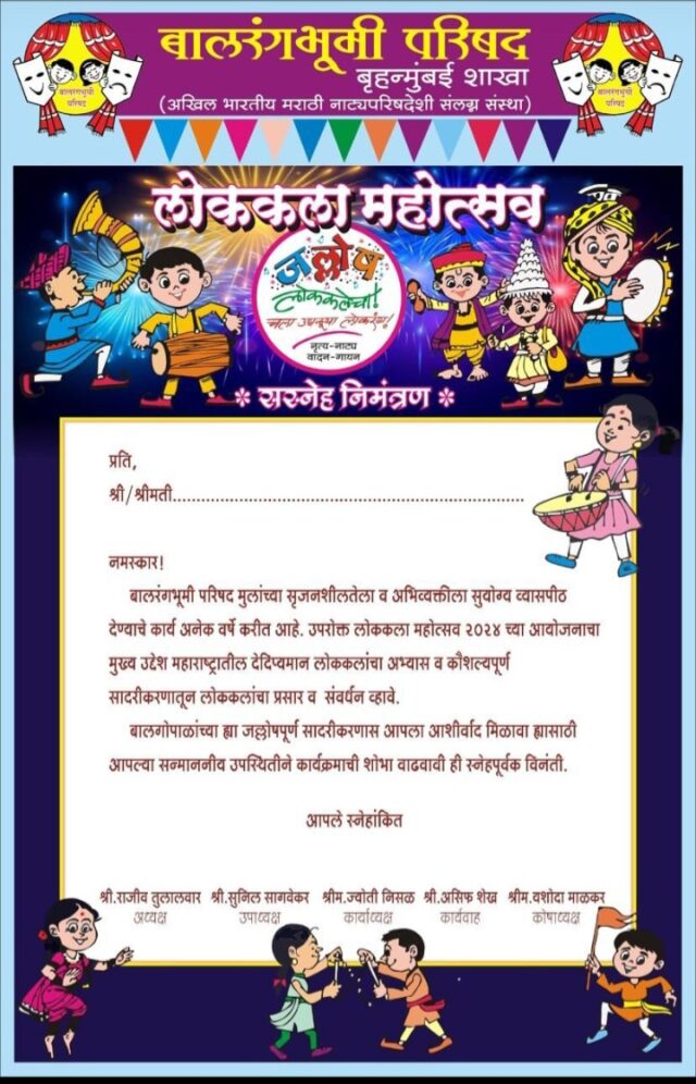 बालरंगभूमी परिषद बृहन्मुंबई शाखा (अखिल भारतीय मराठी नाटयपरिषदेशी संलग्न संस्था) यांचे मार्फत लोककला महोत्सव – दि १८व १९ ऑगष्ट