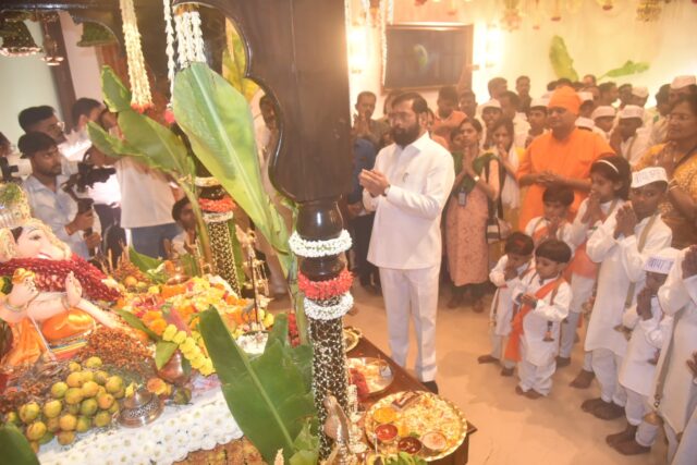 मुख्यमंत्री एकनाथ शिंदे यांचे शासकीय निवासस्थान वर्षा येथील श्री गणेशाची त्र्यंबकेश्वर येथील आधारतीर्थ आश्रमशाळेतील विद्यार्थ्यांच्या हस्ते आरती करण्यात आली. मुख्यमंत्री शिंदे यांच्या समवेत या चिमुकल्यांनी श्री गणेशाची आरती केली. यातील काही विद्यार्थी शेतकरी वेशभूषा करून आले होते.