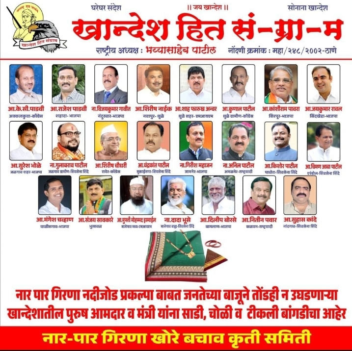 नारपार-गिरणा नदीजोड प्रकल्पावर काम न केल्याचा आरोप करत, खान्देश हित संग्राम संघटनेकडून उत्तर महाराष्ट्रातील २५ आमदार आणि मंत्र्यांना साडी-चोळीचा आहेर कुरियरद्वारे पाठवण्यात आला आहे.