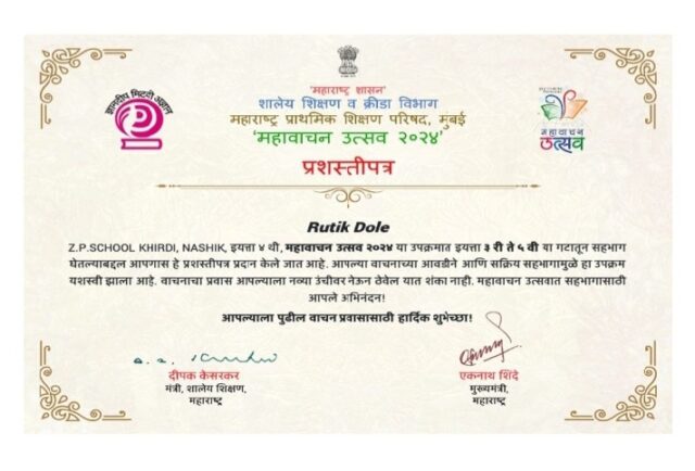 शालेय शिक्षण विभागामार्फत राज्यात ‘महावाचन उत्सव २०२४’ राबविण्यात येत आहे. यामध्ये सहभागी विद्यार्थ्यांना ऑनलाईन पद्धतीने प्रशस्तीपत्र देण्यात येते. विभागाच्या https://mahavachanutsav.org या संकेतस्थळावर हे प्रशस्तीपत्र डाऊनलोड करण्याची सुविधा असून शालेय शिक्षण मंत्री दीपक केसरकर यांनी मान्य केलेले आणि विभागाने उपलब्ध करून दिलेले हे प्रशस्तीपत्र अचूक असल्याची माहिती प्राथमिक शिक्षण परिषदेच्या राज्य प्रकल्प संचालक आर. विमला यांनी दिली आहे.