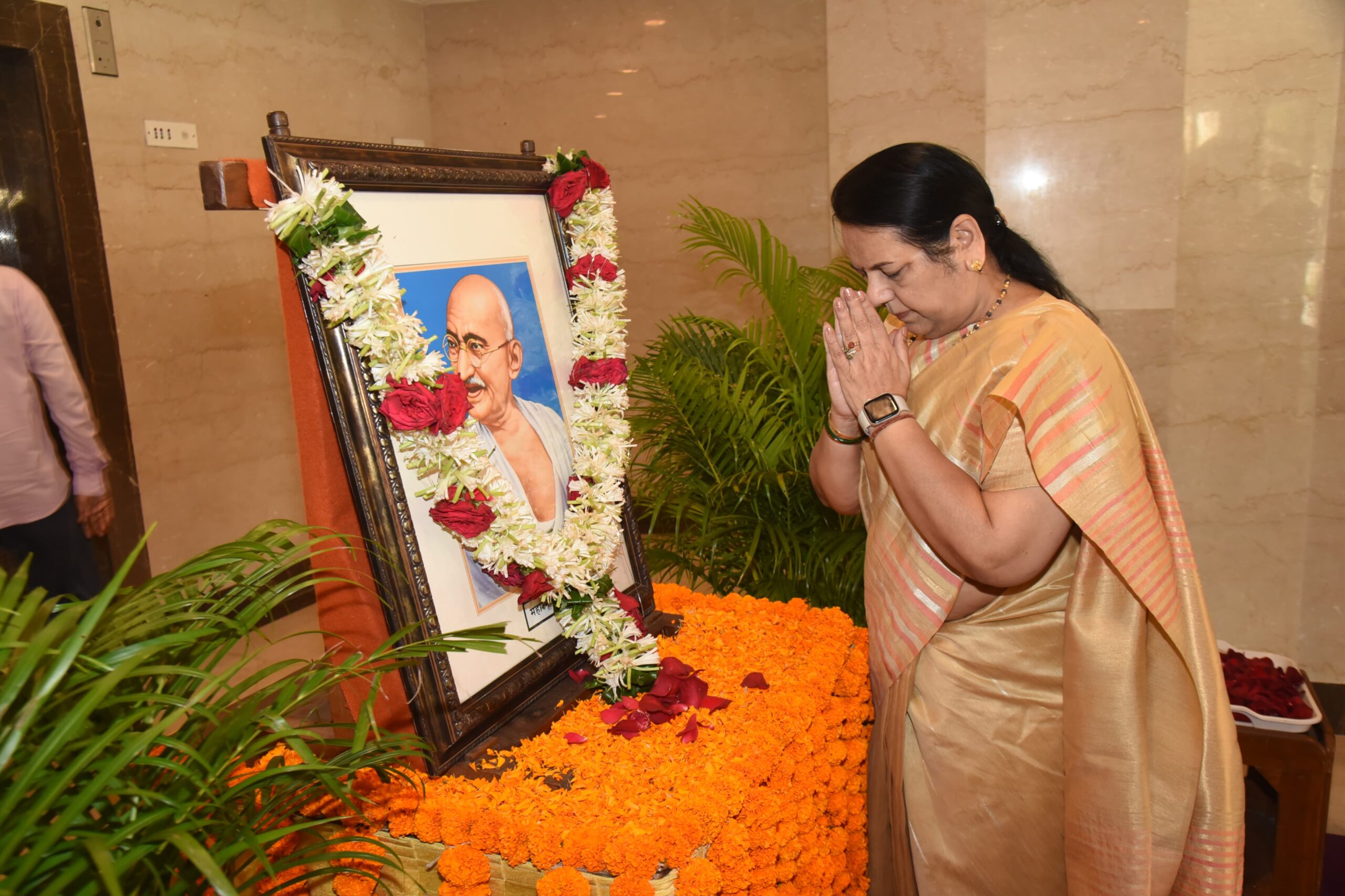 राष्ट्रपिता महात्मा गांधी यांची जयंती आज बुधवार, दिनांक 02 ऑक्टोबर, 2024 रोजी विधान भवनात साजरी करण्यात आली. याप्रसंगी महाराष्ट्र विधानपरिषदेच्या उप सभापती डॉ. नीलम गोऱ्हे यांच्या शुभहस्ते राष्ट्रपिता महात्मा गांधी यांच्या प्रतिमेस पुष्पहार व गुलाबपुष्प अर्पण करुन अभिवादन करण्यात आले.