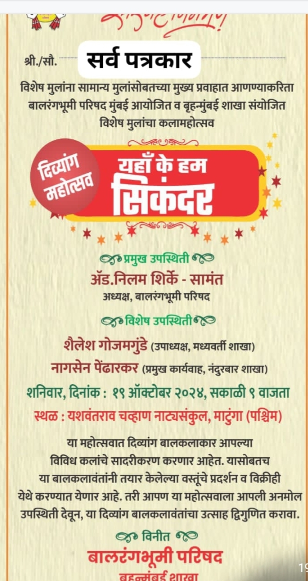 मुंबई – बालरंगभूमी परिषद मुंबई आयोजित व बालरंगभूमी परिषद बृहन्मुंबई शाखा नियोजित ‘यहाँ के हम सिकंदर’ हा दिव्यांग मुलांचा विविध कला गुणांचा महोत्सव दिनांक १९ ऑक्टोबर रोजी सकाळी ९ ते दुपार २ वेळेत यशवंतराव चव्हाण नाट्य संकुल माटुंगा या ठिकाणी रंगणार आहे.
