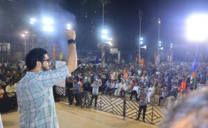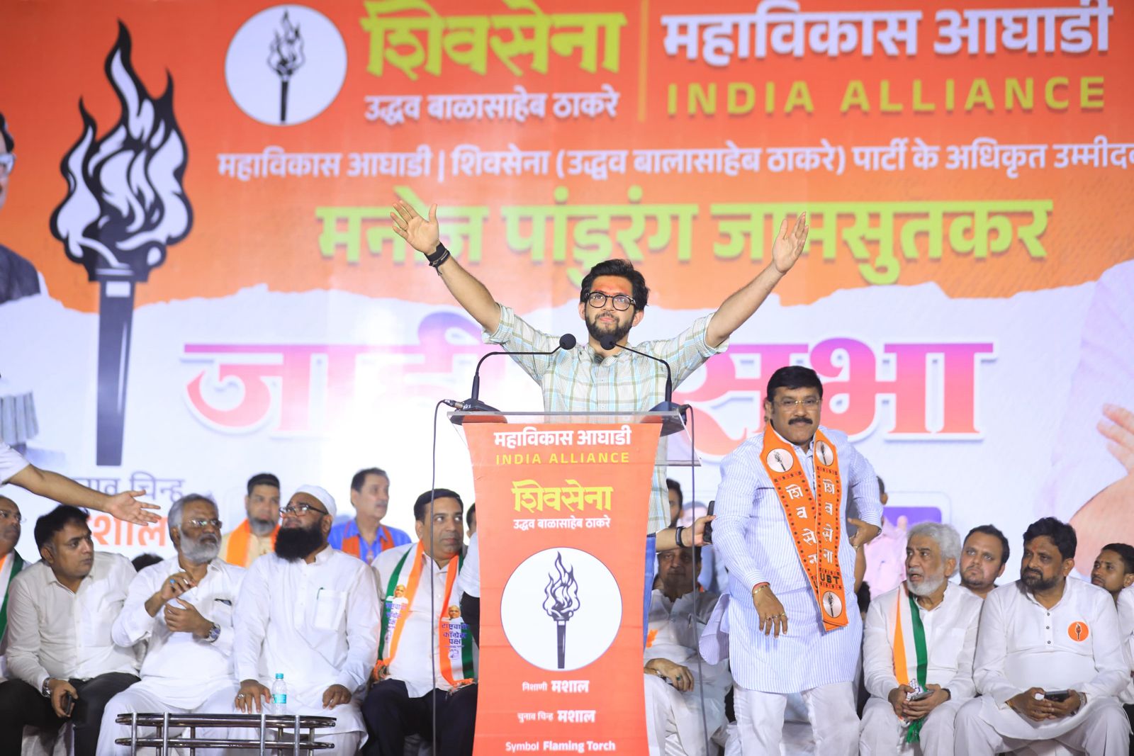 उपस्थित कार्यकर्ते आणि जनतेला संबोधित करताना आदित्य ठाकरे म्हणाले की ‘गेल्या 10 वर्षात एकाच व्यक्तीची मन की बात ऐकली, आता आपल्याला दिल की बात करायची आहे . इथे तरुणांना जॉब नाहीत त्यांचे जॉब हे एकनाथ शिंदेने हिरावून घेतले आहेत . योगी येतात आणि म्हणतात बटोगे तो कटोगे, पण मी तुम्हाला सांगतोय भाजप आपले खिसे कापायला तयार आहे . मी आताही इथं सांगतोय आमच हिंदुत्व अजूनही आहे . आमचं हिंदुत्व म्हणजे हाताला काम आणि हृदयात राम . त्यामुळे आमचं सरकार येणार आहे तेव्हा एकच ध्येय असणार ते म्हणजे जॉब देणं’. असं आदित्य ठाकरे म्हणाले
