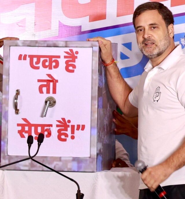 महाराष्ट्र विधान सभेच्या निवडणुकीची लढाई ही एक-दोन उद्योगपती व राज्यातील सर्वसामान्य जनता, शेतकरी, महिला व तरुण यांच्यातील आहे. पंतप्रधान मोदींचा मुंबई व महाराष्ट्राच्या संपत्तीवर डोळा असून ती लुटण्याचे काम सुरु आहे. धारावीची एक लाख कोटी रुपये किंमतीची जमीन एका व्यक्तीला देण्यासाठी सर्व सरकारी यंत्रणा कामाला लागलेली असून मोदींची घोषणा ‘एक हैं तो सेफ हैं’ म्हणजे फक्त अदानी व मोदी ‘एक हैं आणि सेफ ही हैं’ असा जोरदार प्रहार लोकसभेतील विरोधी पक्षनेते राहुल गांधी यांनी केला. यावेळी राहुल गांधींनी पत्रकार परिषदेत एक बंद तिजोरी (सेफ) सादर करून पत्रकारांसमोर ती उघडली. त्यात मोदी आणि अंबानींचा फोटो आणि धारावीचा नकाशा ठेवण्यात आला होता. अदानी-मोदी देश लुटण्यासाठी ‘एक है तो सेफ है’ असा आरोप ही तिजोरी दाखवत राहुल गांधी यानी केला.