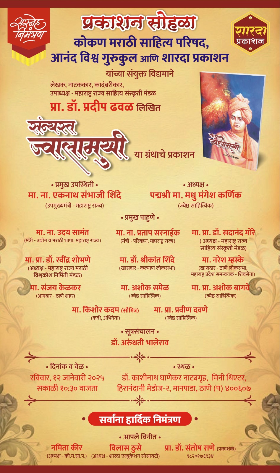 कोकण मराठी साहित्य परिषद, आनंद विश्व गुरुकुल आणि शारदा प्रकाशन यांच्या संयुक्त विद्यमाने, महाराष्ट्र राज्य साहित्य संस्कृती मंडळाचे उपाध्यक्ष, लेखक, नाटककार आणि कादंबरीकार *प्रा. डॉ. प्रदीप ढवळ* लिखित *’संन्यस्त ज्वालामुखी’* या स्वामी विवेकानंद यांच्या प्रेरणादायी जीवनकार्यावर आधारित चरित्रकादंबरीचा प्रकाशन सोहळा आयोजित करण्यात आला आहे.