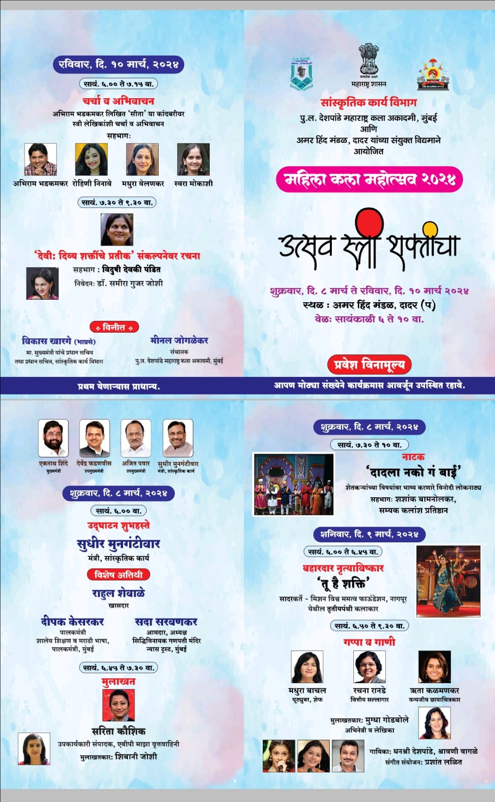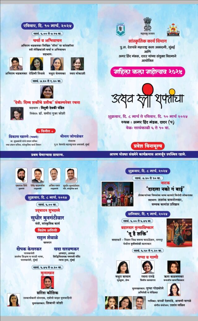 सांस्कृतिक कार्य विभाग, पु. ल. देशपांडे महाराष्ट्र कला अकादमी आणि अमर हिंद मंडळ, दादर यांच्या संयुक्त विद्यमाने महिला कला महोत्सव 2024- ‘उत्सव स्त्री शक्तीचा’ या महोत्सवाचे आयोजन शुक्रवार, दि. ८ मार्च ते रविवार, दि. १० मार्च, २०२४ या कालावधीत करण्यात आले आहे. तीन दिवसांच्या या महोत्सवात रोज संध्याकाळी ६ ते १० या वेळेत विविध चर्चासत्र, मुलाखती, नृत्य, गाण्याचे कार्यक्रम, नाटक सादर केले जातील.