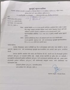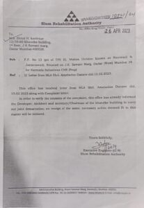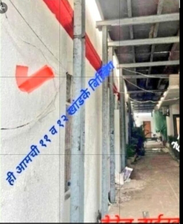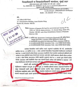 विषय:- विकासक, मे रेर्नसन्स कंस्ट्रक्शने नर्मदा गृहनिर्माण संस्थेच्या (माहीम टी.पी.एस. ३ अ.भू.क्र. १३) झो. पु. प्राधिकरणाच्या योजनेमध्ये अतिरिक्त क्षेत्रफळ त्यांच्या कॅटपल्ट रियल्टी कन्सल्टंट सर्वेक्षण मोजणीच्या कंपनीद्वारे सम्मिलित करून अतिरिक्त चटई क्षेत्र व खांडके बिल्डिंग क्र.११,१२ च्या संरक्षक भिंत तोडून अतिक्रमण केल्याबाबत झो. पु. प्राधिकरणायांचे स्पष्टीकरण प्राप्त झालेले नसताना अंतिम मंजुरी पत्र मा.अधीक्षक, मुंबई नगर भूमापक व भुमि अभिलेख (शहर) यांचे रद्द करण्यात येण्याबाबत….