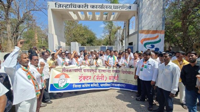 शेतकऱ्यांची फसवणूक करणाऱ्या महायुती सरकारच्या विरोधात धाराशिव येथे ट्रॅक्टर मोर्चा काढण्यात आला. केंद्रातील व राज्यातील भाजपा सरकार शेतकऱ्यांच्या प्रश्नांकडे दुर्लक्ष करीत आहे. शेतकरी विरोधी भाजपा यती सरकारविरोधात धाराशिव येथे ट्रॅक्टर मोर्चा काढण्यात आला. मोर्चामध्ये शेकडो शेतकरी आपापले ट्रॅक्टर घेऊन सामील झाले होते. मोर्चानंतर जिल्हाधिकाऱ्यांना निवेदन सादर करण्यात आले. चंद्रपूर जिल्हा काँग्रेस कमिटीचे अध्यक्ष माजी आमदार सुभाष धोटे यांच्या नेतृत्वाखाली शेतकऱ्यांच्या प्रश्नांवर आंदोलन करण्यात आले यावेळी मोठ्या संख्येने पदाधिकारी व शेतकरी उपस्थित होते.