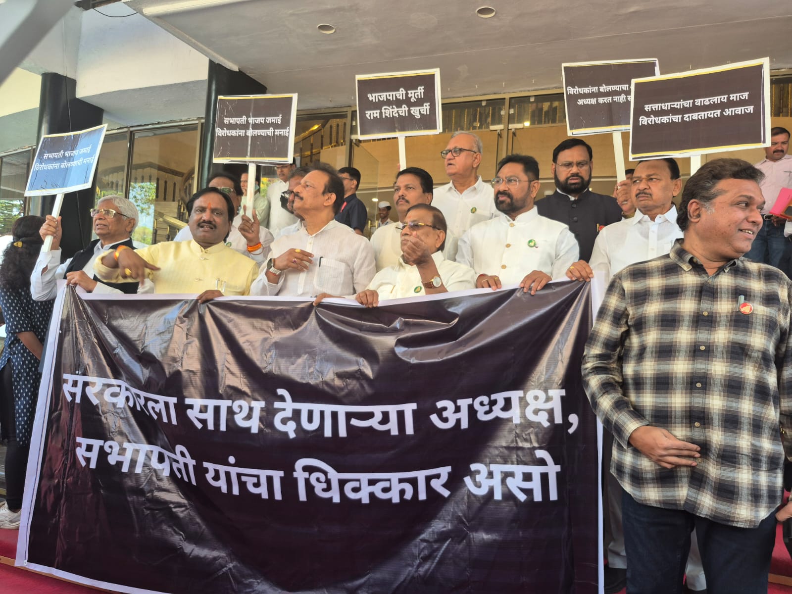नियमबाह्य काम करणाऱ्या सभापती आणि अध्यक्ष विरोधात विरोधकांनी पायऱ्यांवर आंदोलन केलेसभापती पक्षपाती भूमिका घेतात याला विरोध करत महाविकास आघाडीने आंदोलन केले
