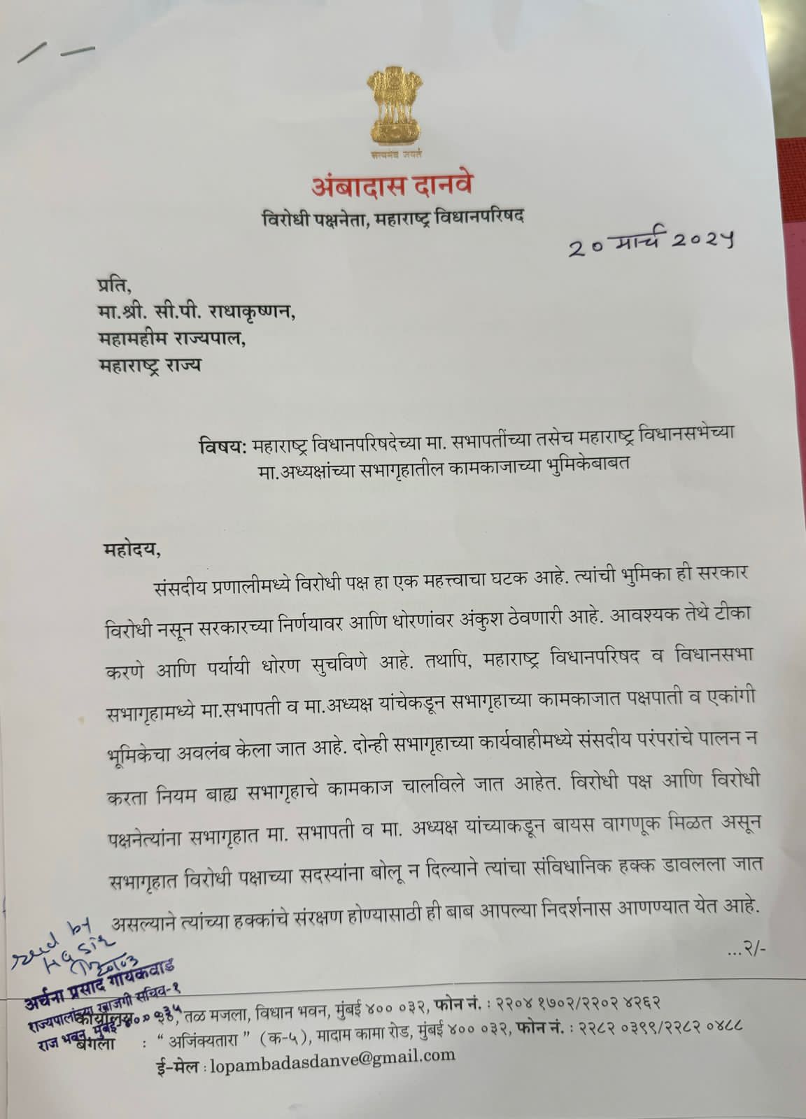 संसदीय प्रणालीमध्ये विरोधी पक्ष हा एक महत्त्वाचा घटक आहे. त्यांची भुमिका ही सरकार विरोधी नसून सरकारच्या निर्णयावर आणि धोरणांवर अंकुश ठेवणारी आहे. आवश्यक तेथे टीका करणे आणि पर्यायी धोरण सुचविणे आहे. तथापि, महाराष्ट्र विधानपरिषद व विधानसभा सभागृहामध्ये मा. सभापती व मा. अध्यक्ष यांचेकडून सभागृहाच्या कामकाजात पक्षपाती व एकांगी भूमिकेचा अवलंब केला जात आहे. दोन्ही सभागृहाच्या कार्यवाहीमध्ये संसदीय परंपरांचे पालन न करता नियम बाह्य सभागृहाचे कामकाज चालविले जात आहेत. विरोधी पक्ष आणि विरोधी पक्षनेत्यांना सभागृहात मा. सभापती व मा. अध्यक्ष यांच्याकडून बायस वागणूक मिळत असून सभागृहात विरोधी पक्षाच्या सदस्यांना बोलू न दिल्याने त्यांचा संविधानिक हक्क डावलला जात असल्याने त्यांच्या हक्कांचे संरक्षण होण्यासाठी ही बाब आपल्या निदर्शनास आणण्यात येत आहे.
